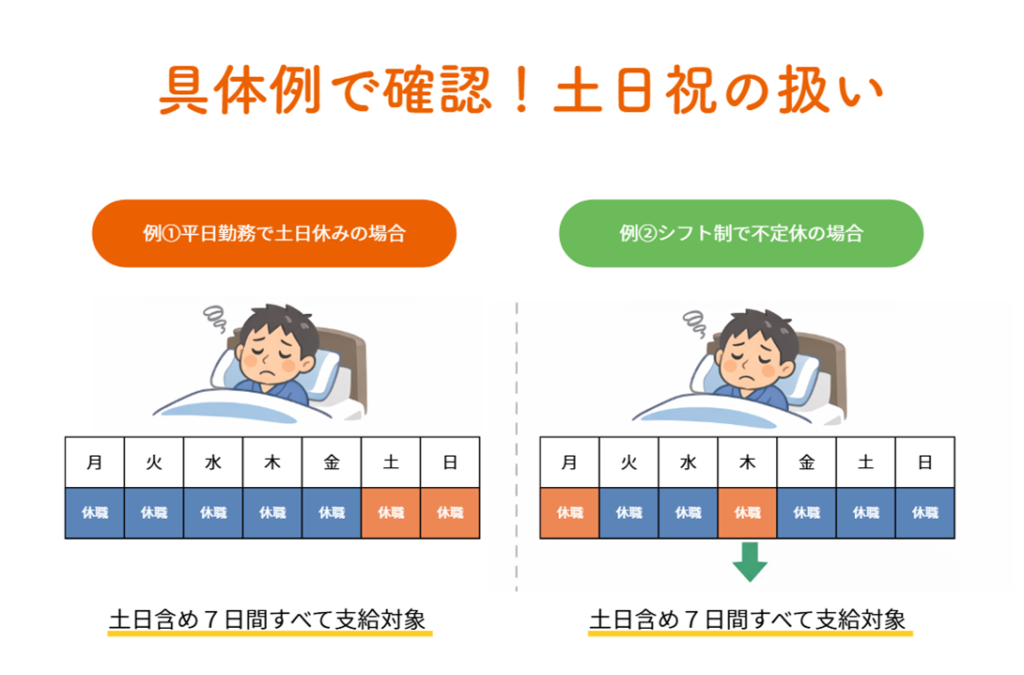 土日は労務不能と認められず、対象外になることがあります。