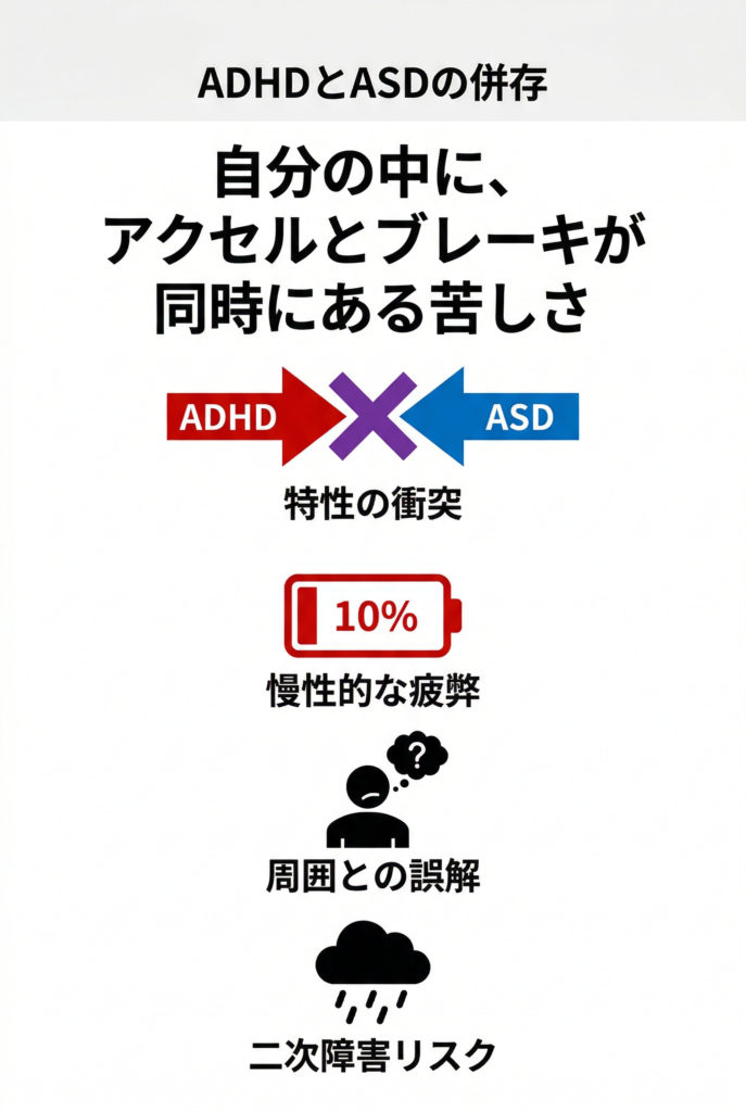 「新しい刺激を求めるADHD」と「変化を嫌うASD」のように、自分の中に矛盾する特性が共存するため、心身の消耗が激しく、うつや不安障害などの二次障害を招きやすいのが特徴です。